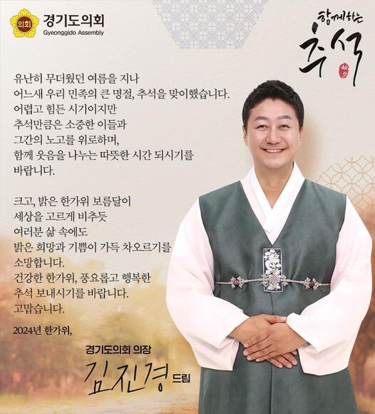 이와 관련해 김진경 경기도의회 의장은 14일, 자신의 페이스북을 통해 요즘 어렵고 힘든 시기이지만, 추석 만큼은 소중한 이들과 그간의 노고를 위로하며, 함께 웃음을 나누는 따뜻한 시간 되시기를 바란다고 전했다.