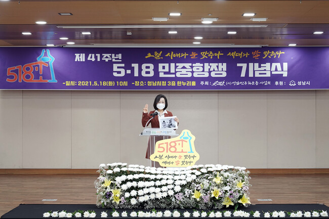 은수미 성남시장은 18일 오전 시청 한누리실에서 열린 ‘제41주년 5·18민중항쟁 기념식’에 참석해 “광주는 우리 곁에 여전히 펄떡펄떡 살아있다.”고 강조했다.