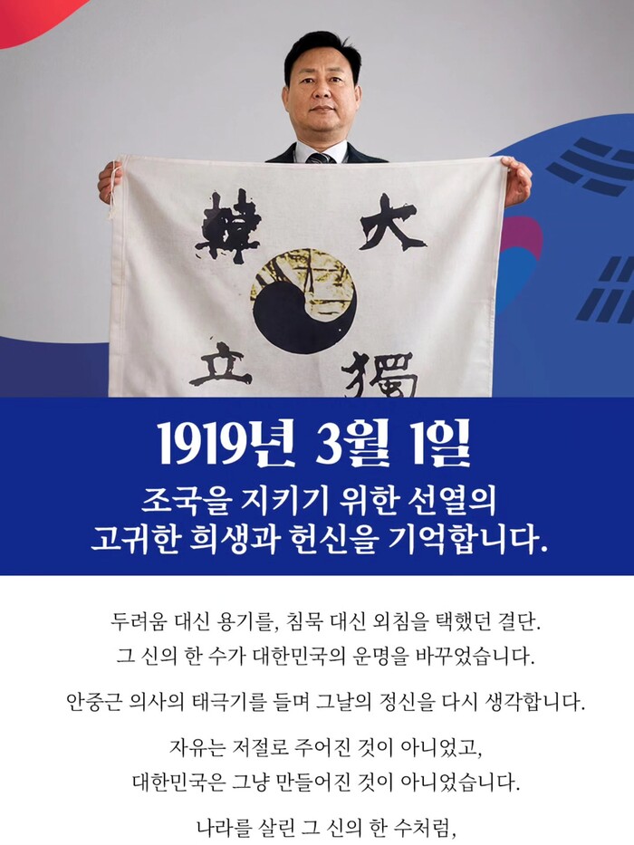 그러면서 안중근 의사의 태극기를 들며 그날의 정신을 다시 생각한다. 자유는 저절로 주어진 것이 아니었고, 대한민국은 그냥 만들어진 것이 아니었다. 나라를 살린 그 신의 한 수처럼, 시민을 위한 책임 있는 한 수를 고민하겠다고 전했다.