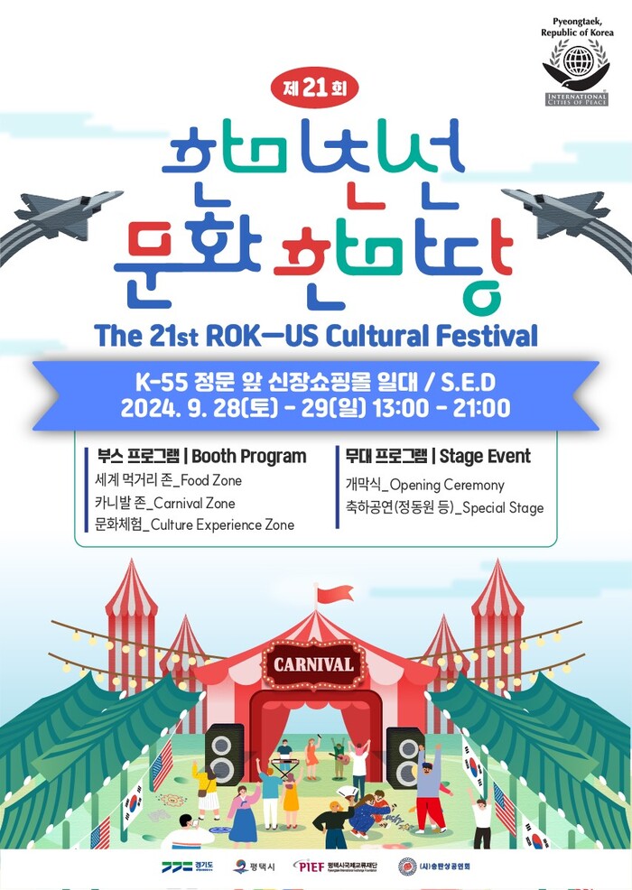 경기도와 평택시가 주최하고 평택시국제교류재단이 주관하는 제21회 한미친선 문화 한마당 축제가 오는 9월 28일부터 29일까지 양일간 개최된다.