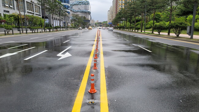 수원시는 다산공원에서 수원컨벤션센터 사거리, 센트럴파크로사거리에 이르는 460m 구간에 노면 빗물분사시스템과 빗물공급기 1개를 설치했다. 지난해 11월 공사를 시작해 최근 완공했다.