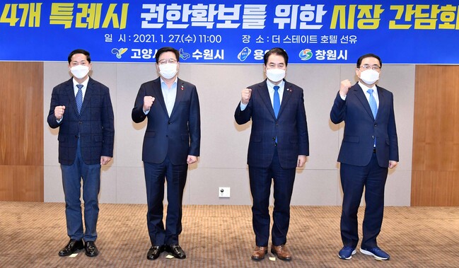 용인시는 27일 서울 영등포구에 위치한 더스테이트 호텔 선유에서 백군기 시장과 이재준 고양시장, 염태영 수원시장, 허성무 창원시장 등 4개 특례시 시장이 함께 ‘특례시 권한 확보를 위한 4개 특례시 시장 간담회’를 가졌다고 밝혔다.