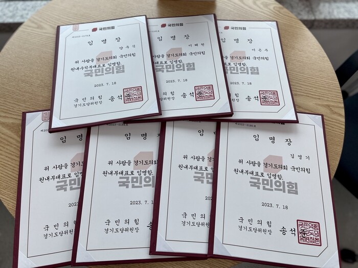 경기도의회 국민의힘 신임 대표단이 국민의힘 경기도당으로부터 임명장을 받고 교섭단체 직위에 대한 정식 추인을 얻었다고 18일 밝혔다.