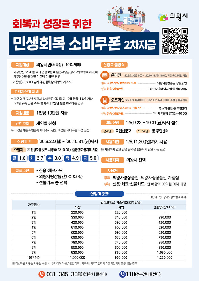 의왕시(시장 김성제)는 시민들의 생활 안정을 돕기 위해 ‘민생회복 소비쿠폰 2차 지급’을 9월 22일(월)부터 10월 31일(금)까지 추진한다.