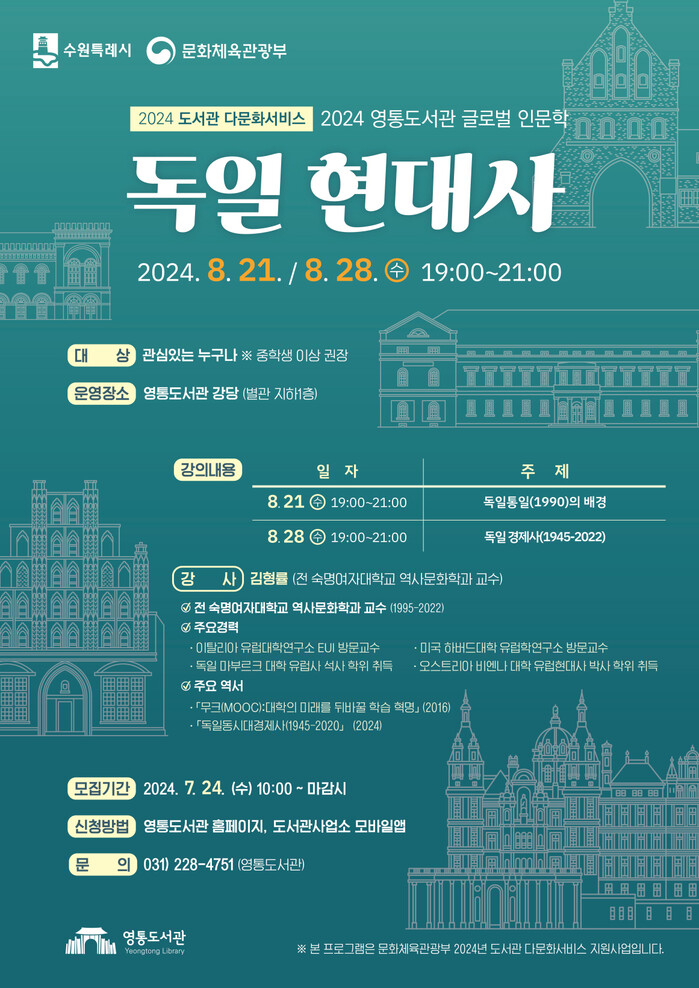 수원시(시장 이재준)가 2024 글로벌 인문학 강의인 ‘독일 현대사’, ‘19세기 독일문학 속, 인간의 사랑과 죽음’의 수강생을 모집한다.