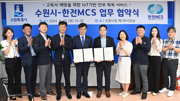 수원시와 한전MCS는 22일 수원시청에서 ‘고독사 예방, 사회적 고립 가구 지원을 위한 안부똑똑 사업 업무 협약’을 체결하고 협력을 약속했다. 김현수 수원시 제1부시장과 정성진 한전MCS 사장이 협약서에 서명했다.