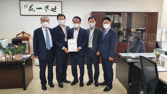 사진/권찬호 수원시 기획조정실장(오른쪽 2번째)을 비롯한 4개 특례시 실·국장이 박성호 자치분권실장에게 건의서를 전달하고 있다.(사진제공=수원시)