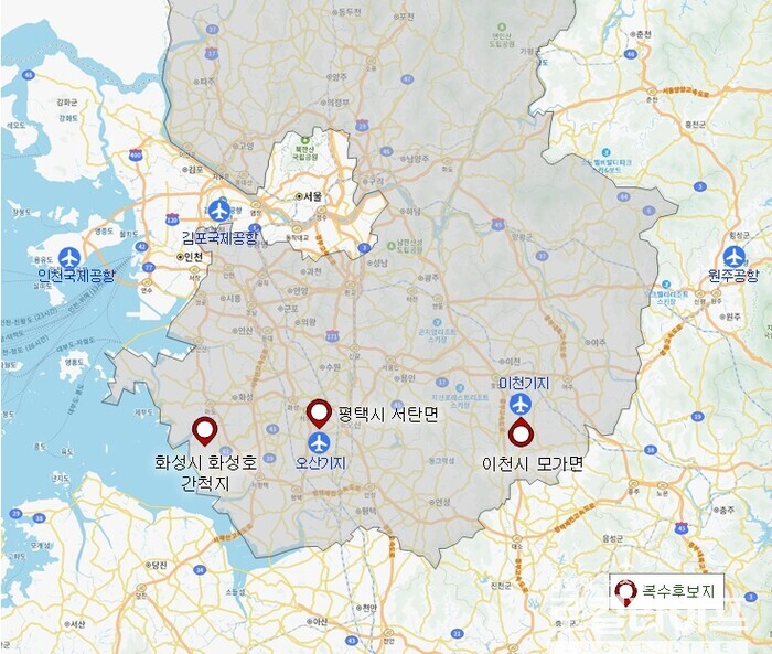 | ▲ 경기국제공항추진단은 지난 2024년 11월 8일, 경기국제공항 건설 후보지로 화성시 화성호 간척지, 평택시 서탄면, 이천시 모가면 등 3곳을 발표했다. 자료는 경기국제공항 건설 후보지 위치도. (자료제공=경기도) |