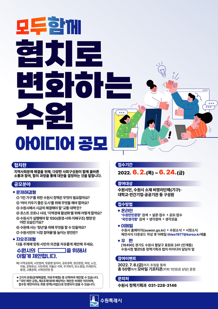 수원시가 6월 2일부터 24일까지 ‘2022년 수원시 협치 아이디어’를 공모한다.