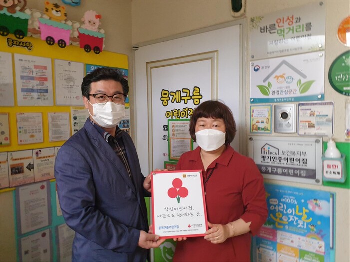 평택행복나눔본부에서는 지난 12일 뭉게구름어린이집(원장 옥광선)에 착한 어린이집 현판을 전달했다.