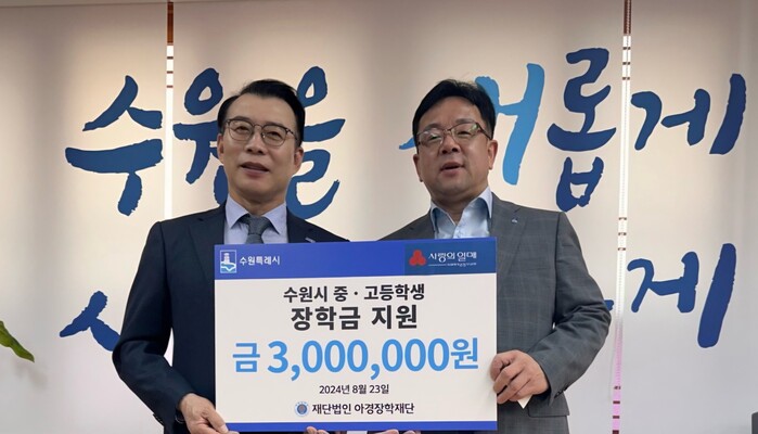 아경장학재단은 지난해 9월에도 수원시에 취약계층 중·고등학생을 위한 장학금 300만 원을 기탁한 바 있다.
