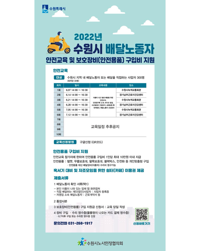 배달노동자에게 안전한 노동환경을 만들어주기 위해 노력하고 있는 수원시는 6월 7일부터 매주 화요일, 10회에 걸쳐 ‘배달노동자 안전교육’을 열 예정이다.