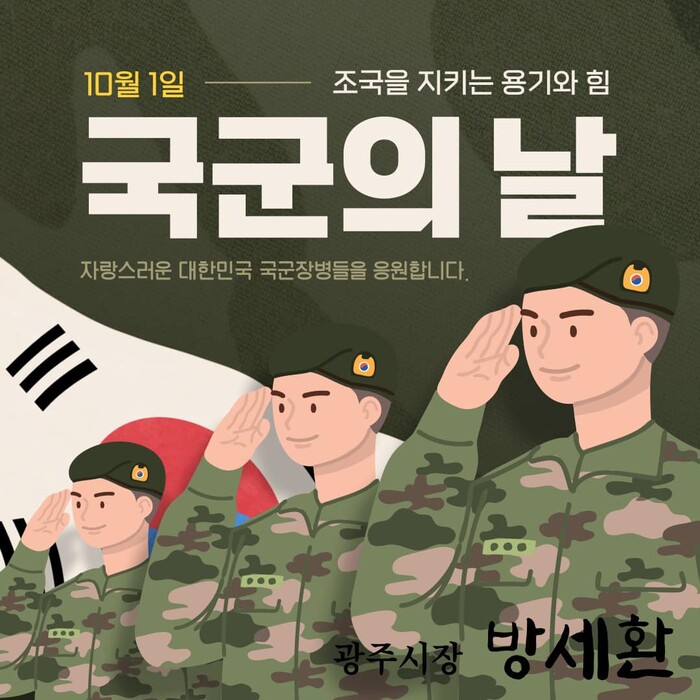 아울러 방 시장은 국민에게 믿음을 주는 강한 우리 국군을 응원하며, 우리의 일상을 지켜주는 모든 군인들께 감사하는 마음으로 오늘 하루를 시작하겠다고 덧붙였다.