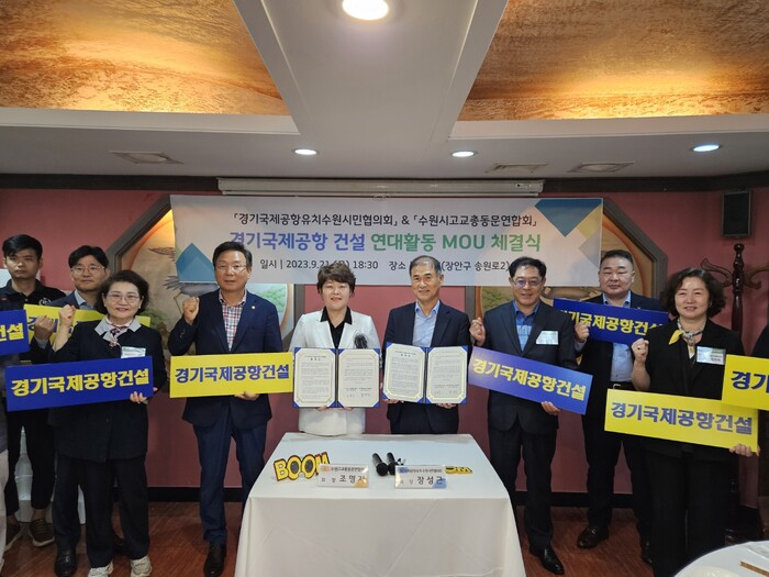 [로컬라이프] 경기국제공항유치수원시민협의회(이하 ‘시민협의회’)는 21일부터 23일까지 3일간 수원시고교총동문연합회, 장안사랑발전회, 권선사랑연합회, 수원시사회복지협의회, 화훼연구회 등 16개 단체와 수원 군공항 이전 및 경기국제공항 건설을 위한 상호협력 협약(MOU)을 체결했다.