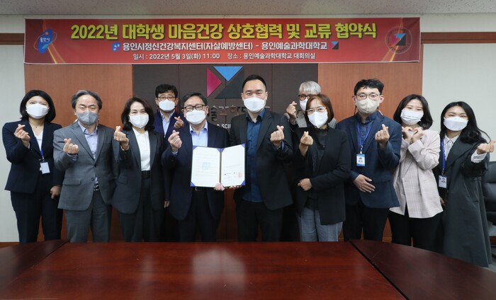 용인시 자살예방센터(센터장 김한성)가 3일 용인예술과학대학교(총장 최성식)와 대학생들의 정신건강과 생명존중문화 조성을 위해 업무협약을 체결했다.