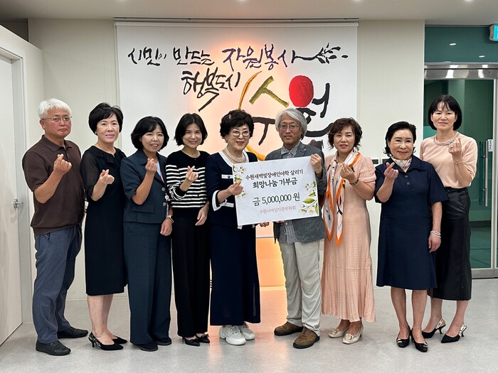 수원시여성자문위원회가 20일 수원시자원봉사센터에 500만 원을 전달하며 ‘수원새벽빛 장애인 야학 살리기’ 모금 활동에 동참했다.