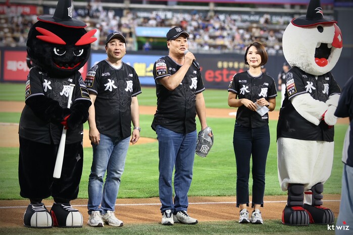 사진/정찬해 수원화성문화제 추진위원회 공동위원장이 시구 전 인사말을 하고 있다.(사진 가운데 정찬해 공동위원장, 왼쪽 김주호 사무총장) 사진제공=KT 위즈
