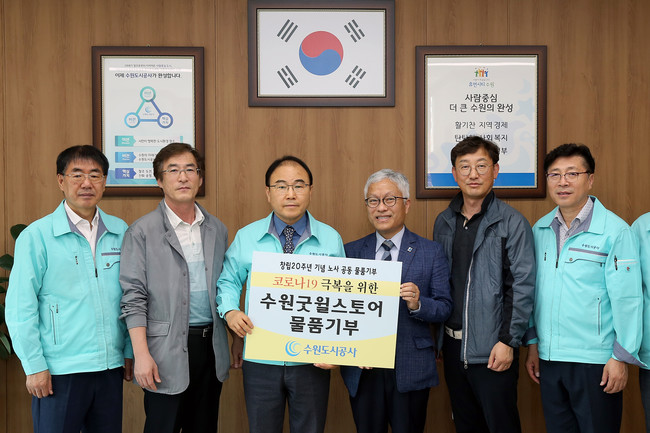 [수원=로컬라이프] 송준형 기자 = 7일 오전 수원시 권선구 더함파크에서 열린 ‘수원도시공사 노사 공동 굿윌스토어 물품기부금 전달식’에서 이부영 사장, 이일준 수원굿윌스토어 원장(사진 왼쪽 세 번째부터) 등 양 기관 관계자들이 기념촬영을 하고 있다.