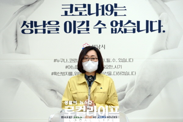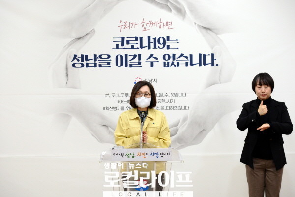 | ▲ 성남시는 중위소득 100% 이하인 16만 8171가에 성남사랑상품권(모바일) 또는 직불카드로 긴급 생활안전 자금을 직접 지원할 계획이다. 사진은 은수미 성남시장의 브리핑 모습. (사진제공=성남시) |