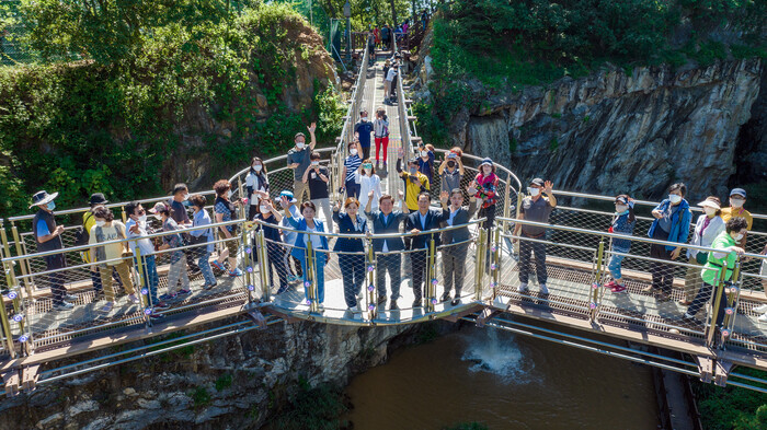 [로컬라이프] 송준형 기자 = 광명시는 지난 27일 도덕산 인공폭포 상부에서 박승원 광명시장, 국회의원, 도의원, 시의원, 지역 주민 등 약 100여 명이 참석한 가운데 도덕산 인공폭포 출렁다리 개통식을 가졌다.