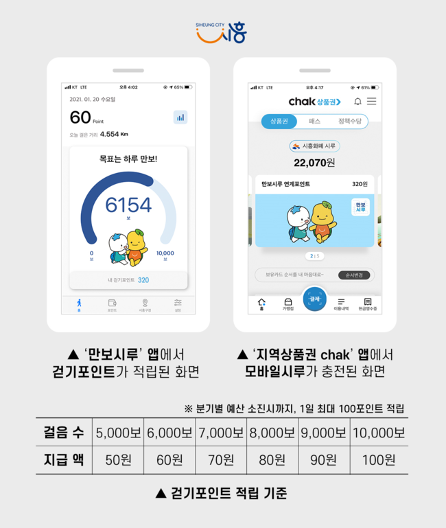 만보시루 앱은 5천보부터 1만보까지 사용자의 목표 걸음 수에 따라 1일 최대 100원의 포인트가 적립된다. 적립된 포인트는 시흥시 지역화폐인 ‘모바일시루’로 실시간 전환해 사용할 수 있다.