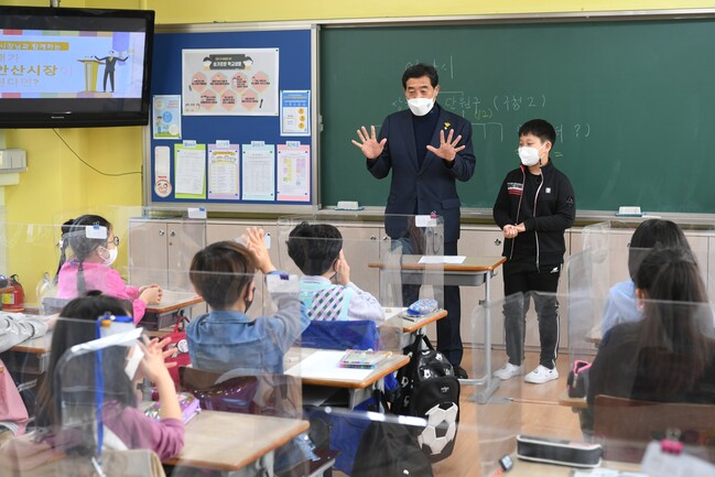 슬기초등학교 3학년4반을 방문한 윤 시장은 학생 22명 눈높이에 맞춰 시장의 역할과 의미를 교육하며, ‘안산’이라는 도시의 특성과 자랑거리를 설명했다.