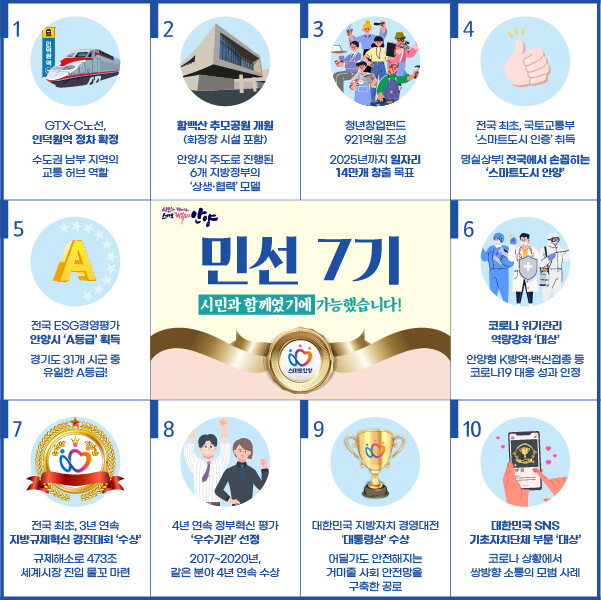 안양형 K방역과 높은 백신접종률 등 코로나19를 극복하려는 노력도‘민선7기 스마트시정 톱10’에 포함됐다. 안양시는 안양형 K방역과 백신접종 그리고 소상공인과 자영업자 등 취약계층 지원 등으로‘2021 코로나 위기관리 역량강화 대상’을 수상했다. 코로나19 창궐 초기인 2020년 1월 28일 일찌감치 재난안전대책본부를 구성한 가운데 방역과 백신접종, 환자후송, 기관협의를 통한 마스크 보급, 임시격리시설 운영, 역학조사관 추가임명, 방역기동T/F 가동, 관련 조례 제정, 취약계층 자금지원 및 세제혜택 등 타 시와 차별되는 수많은 사업을 추진하며 코로나19 극복에 안간힘을 기울인 결과다. 11월 들어서는 정부의 위드코로나 발표에 부응해 공공복지 및 문화체육 시설을 잇따라 재개방 및 운영을 연장하며 시민들의 일상회복을 돕는다. 이와 더불어 시는 선별진료소 시설 확충을 통해 효과적으로 운영하는 한편, 확진자 폭발적 증가에도 대비하고 있다.