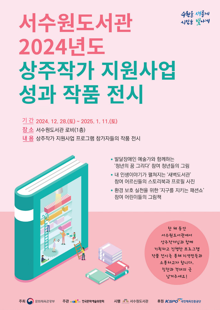 서수원도서관이 2025년 1월 11일까지 도서관 1층 로비에서 ‘2024 상주작가 지원사업’에서 진행했던 프로그램 작품을 전시한다. 문학 프로그램에서 지역 주민들이 창작한 작품 30여 점을 선보인다.