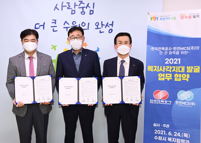 수원시는 24일 시청 복지여성국장 집무실에서 한국전력공사 서수원지사, 한전MCS(주) 서수원지점과 ‘복지사각지대 발굴 업무협약’을 체결하고, 협력을 약속했다.