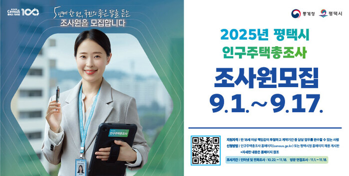 평택시(시장 정장선)는 오는 11월 1일(토)부터 18일(화)까지 통계청 주관으로 실시하는 2025년 인구주택총조사를 수행할 조사원 300명을 모집한다.