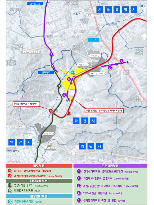 과천시는 추진되는 10개 사업 중 특히, 과천~이수간 복합터널, 위례~과천선 등은 김종천 과천시장이 민선7기 공약사항이며, 과천~우면산간 도시고속화도로 지하화, 과천대로~헌릉로 연결도로 개설, 환승시설 건설 등은 과천시가 제안하여 추진되는 사업으로, 과천시가 마련한 교통 대책이 국토교통부와의 협의를 통해 상당 부분 반영되는 성과를 얻었다고 설명했다.
