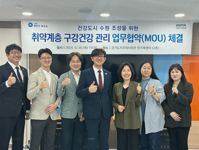 수원시 장안구보건소와 수원시치과의사회가 5월 30일 경기도치과의사회관 한가족센터에서 ‘취약계층 구강건강관리를 위한 업무협약’을 체결하고, 수원시 취약계층 시민의 구강건강 관리를 위해 협력하기로 했다.