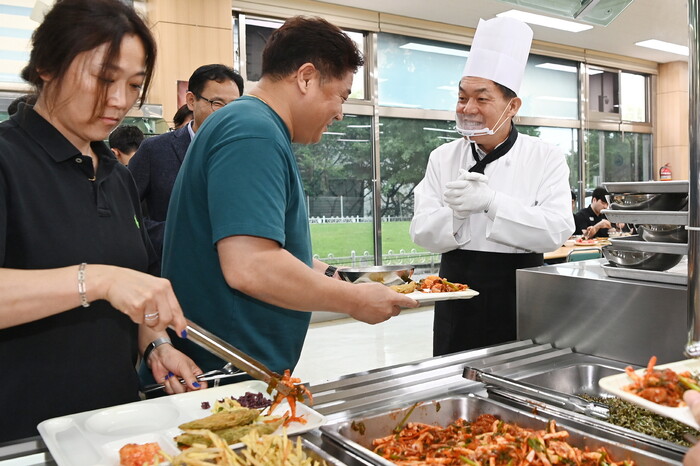 이재준 수원특례시장이 무더위에도 훈련에 매진하는 ‘수원특례시청 직장운동경기부’ 선수들에게 말복을 맞아 삼계탕을 배식하고, 격려했다.
