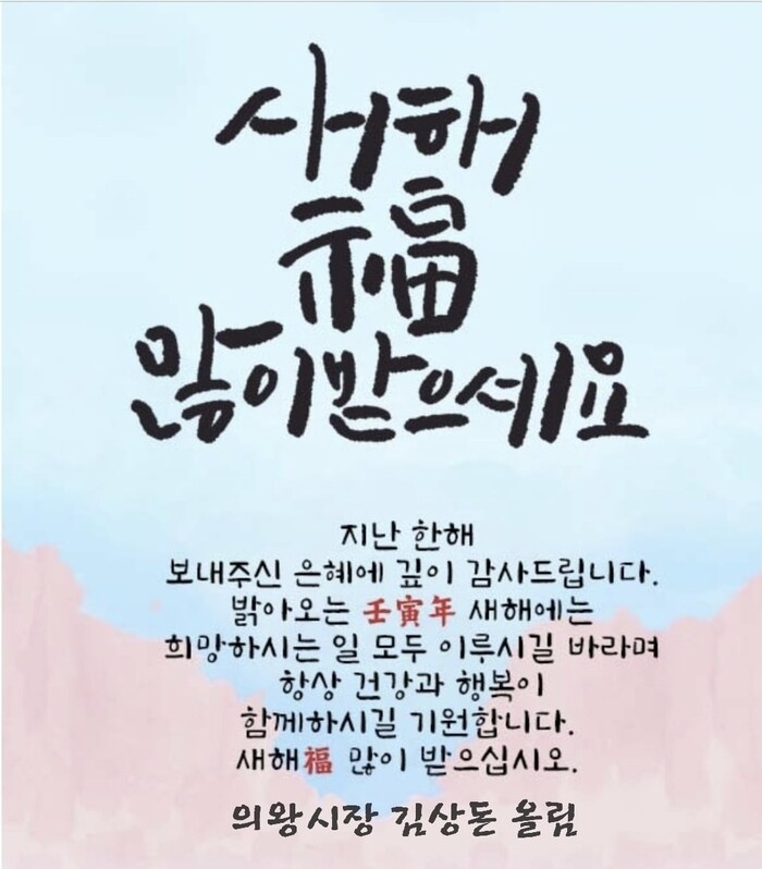 [로컬라이프] 김상돈 의왕시장은 31일, 자신의 페이스북을 통해 지난 한해 보내주신 은혜에 깊이 감사드린다면서, 밝아오는 임인년 새해에는 희망하시는 일 모두 이루시길 바라며, 항상 건강과 행복이 함께하시길 기원한다. '새해 복 많이 받으십시오'라고 전했다.
