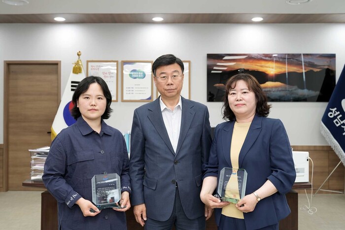 성남시는 정자교 보행로 붕괴 사고 때 부상자 구조활동을 한 김민서(57·구미동), 유희라(37·상대원동) 씨에게 5월 12일 오후 시장실에서 감사패를 전달했다.