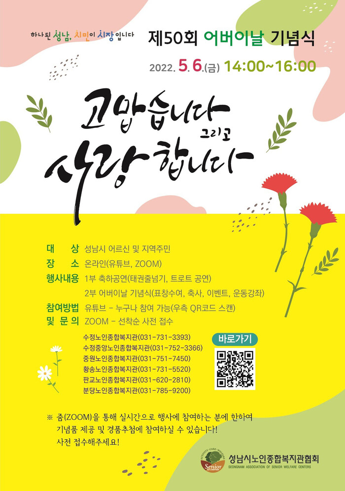 성남시는 오는 5월 6일 오후 2시~4시 시청 1층 온누리에서 ‘제50회 어버이날 기념행사’를 연다.