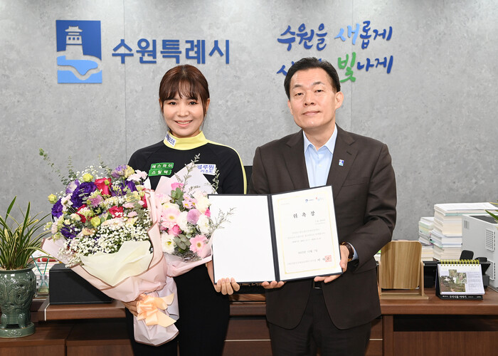 이재준 수원특례시장은 27일 집무실에서 스롱 피아비(Sruong Pheavy) 선수에게 위촉장을 수여하고, 캄보디아 수원마을 홍보대사로 연임 위촉했다. 스롱 피아비는 2020년 12월 홍보대사로 위촉된 바 있다.