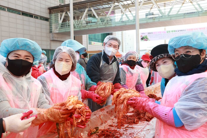 용인특례시(시장 이상일)는 14일 시청 광장에서 용인시자원봉사센터 주관으로 열린 ‘2023 용인사랑나눔 김장축제’에 자원봉사자 350여명이 참여해 김장 김치 7톤을 만들었다고 밝혔다.