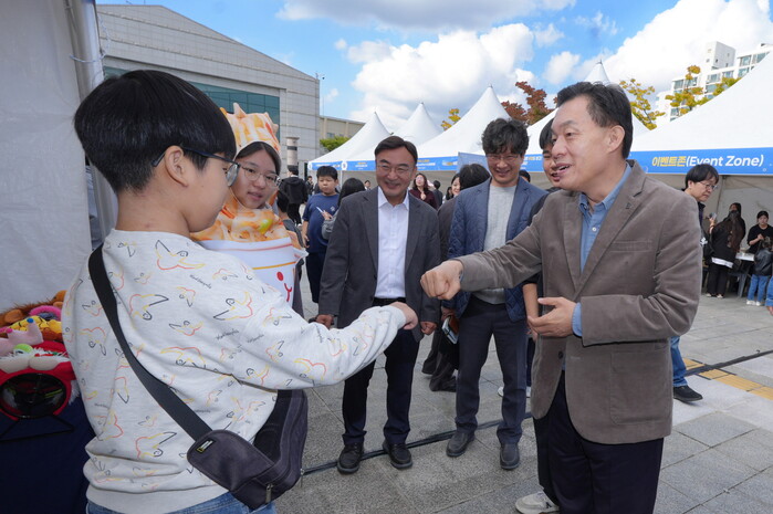 사진/이재준 수원시장이 수원시 청소년대축제에 참가한 청소년과 인사하고 있다.(사진제공=수원시)