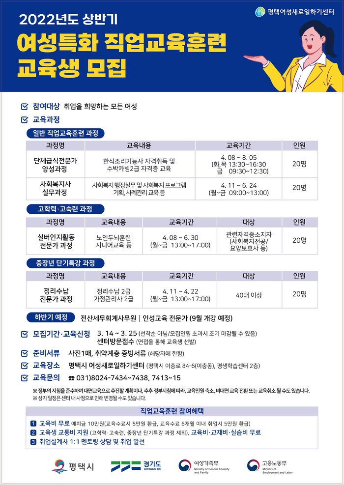 평택여성새로일하기센터는 경력단절여성의 취업역량을 강화하고 지역사회 및 산업체 요구에 적합한 여성인력을 양성하기 위해 2022년 여성특화 직업교육훈련을 실시한다.