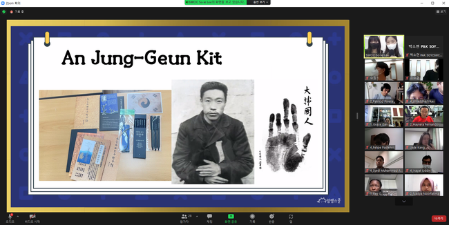 사진/ 지난 14일 온라인으로 진행된 ‘수원(One)데이’ 역사골든벨 프로그램에 참여한 외국인 주민들이 독립운동가 안중근에 대해 배우고 있다.(사진제공=수원시)