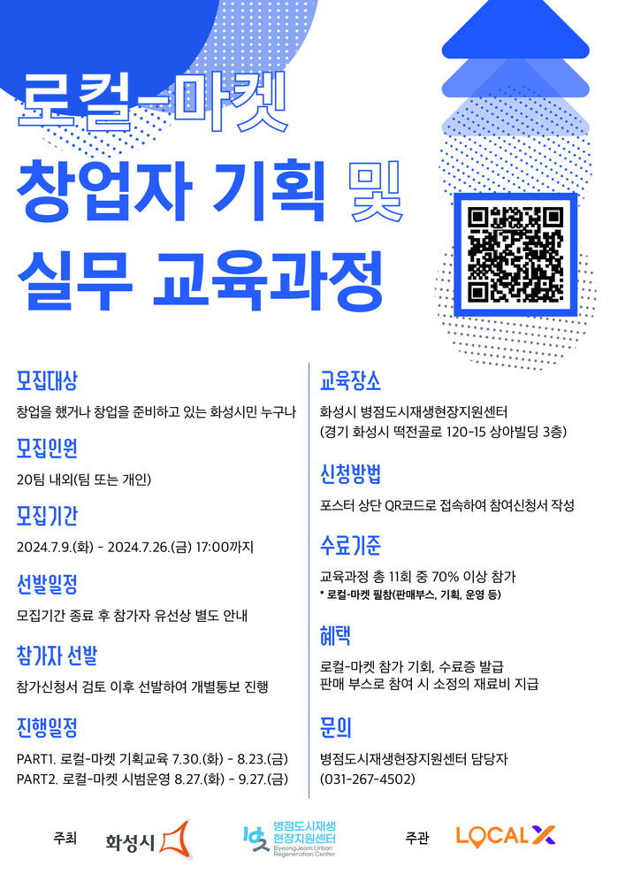 화성시(시장 정명근)가 예비창업자 또는 창업자가 로컬마켓을 활용한 새로운 수익모델을 개발하고 직접 마켓을 운영해볼 수 있도록 지원하는 ‘로컬-마켓 창업자 기획 및 실무 교육과정’ 참가자를 오는 26일까지 모집한다.