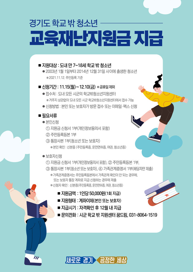 수원시가 12월 10일까지 ‘경기도 학교 밖 청소년 교육재난지원금’ 신청을 받는다.