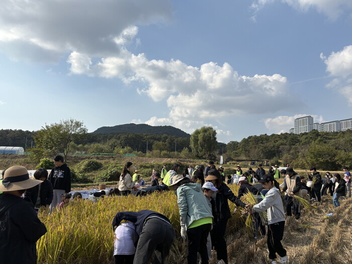 사진/시민과 함께하는 가을걷이 행사에 참여한 시민들이 추수를 하고 있다(사진제공=수원시)