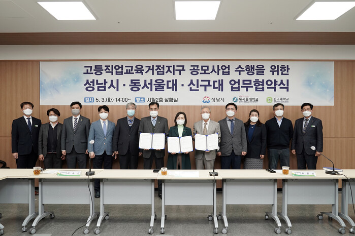 성남시(시장 은수미)는5월3일 오후2시 시청 상황실에서‘고등직업교육거점지구 공모사업(이하, HiVE사업)’을 추진하기 위해 동서울대학교(총장 유광섭),신구대학교(총장 이숭겸)와 업무협약을 체결했다.