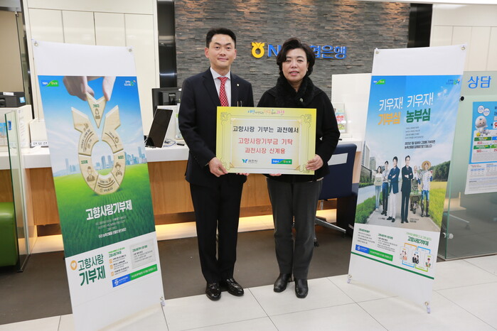 신계용 시장은 올해 시행된 고향사랑기부제를 홍보하고, 시민의 관심과 참여를 이끌어내기 위해 지난 20일 NH농협은행 과천시지부(별양동)에 방문해 고향사랑기부금을 기탁했다.