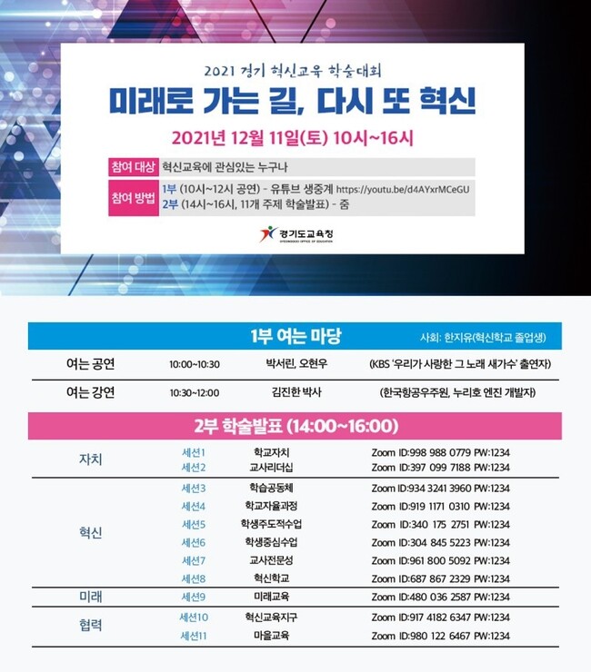 학술대회에 참여하려면 유튜브에서 학술대회 이름(2021 경기혁신교육 학술대회)을 검색하거나 https://youtu.be/d4AYxrMCeGU로 접속하면 된다.