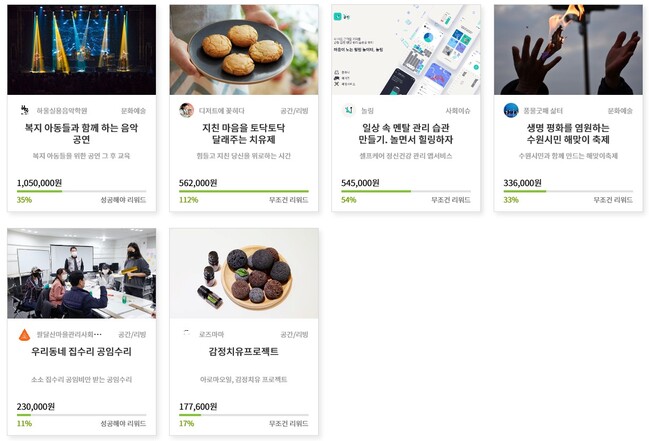 후원형 프로젝트는 복지아동들과 함께하는 음악 공연 지친 마음을 토닥토닥 달래주는 치유제 일상 속 멘탈 관리 습관 만들기, 놀면서 힐링하자 생명 평화를 염원하는 수원시민 해맞이 축제 우리동네 집수리 공임수리 감정치유 프로젝트 등 6개다.