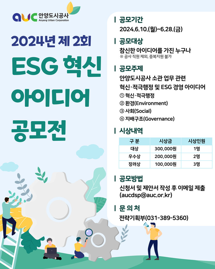 안양도시공사는 오는 28일까지 ‘제2회 ESG·혁신 아이디어 공모전’을 시행한다고 밝혔다.