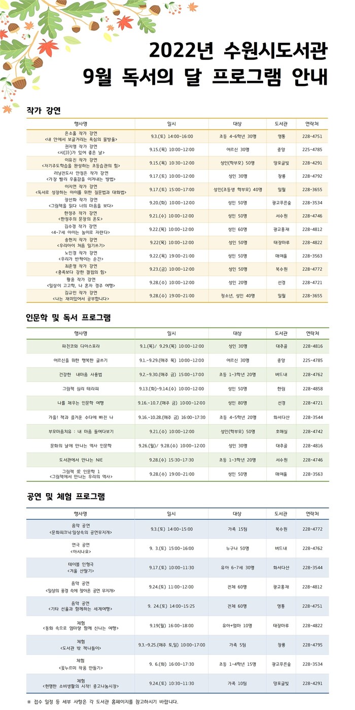 수원시 관계자는 “변화하는 독서 환경에 발맞춰 시민들이 다채롭게 참여할 수 있는 풍성한 독서문화 프로그램을 마련했다”며 “올가을에는 많은 시민이 독서 활동으로 공감과 치유의 시간을 보내길 바란다”고 말했다.